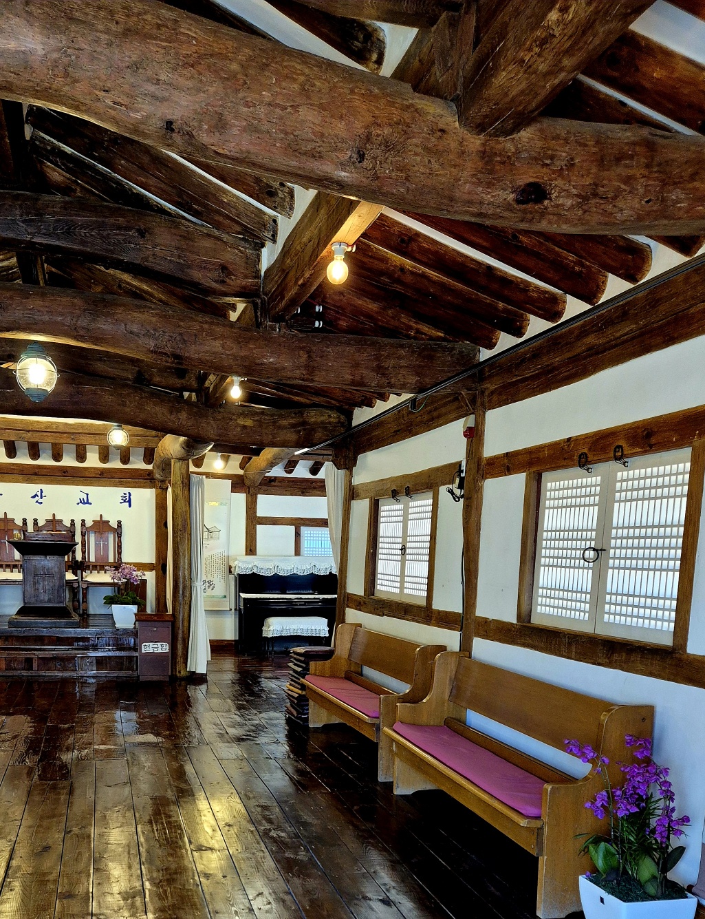 ㄱ자형 한옥교회로 1905년에 건축한 평면 5칸의 장방형에 2칸을 덧붙여져 ㄱ자가 된 특이한 교회입니다. 120년 된 역사적인 교회로 남자와 여자가 나누어 예배를 보도록 하고 남녀가 분리하여 출입하도록 출입문도 만들어져 있답니다. 한국 전통사회의 남녀 구별의 문제점을 건축구조물로 해결한 교회입니다. 1988년에는 한옥교회 옆에 현대식 2층 교회를 건립하여 한식과 양식의 특징을 조화롭게 결합시킨 교회랍니다. 교회 안에 들어와 주변을 살펴본 후에 ㄱ자 한옥교회도 문이 잠겨 있지 않아 다행히 내부의 모습도 볼 수 있었답니다.